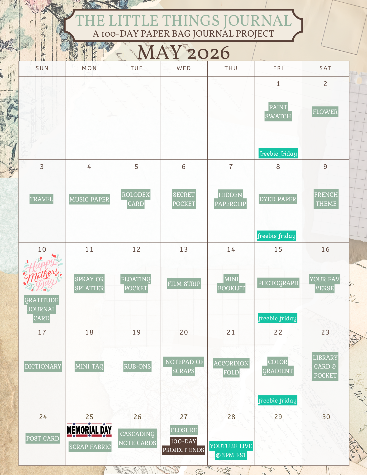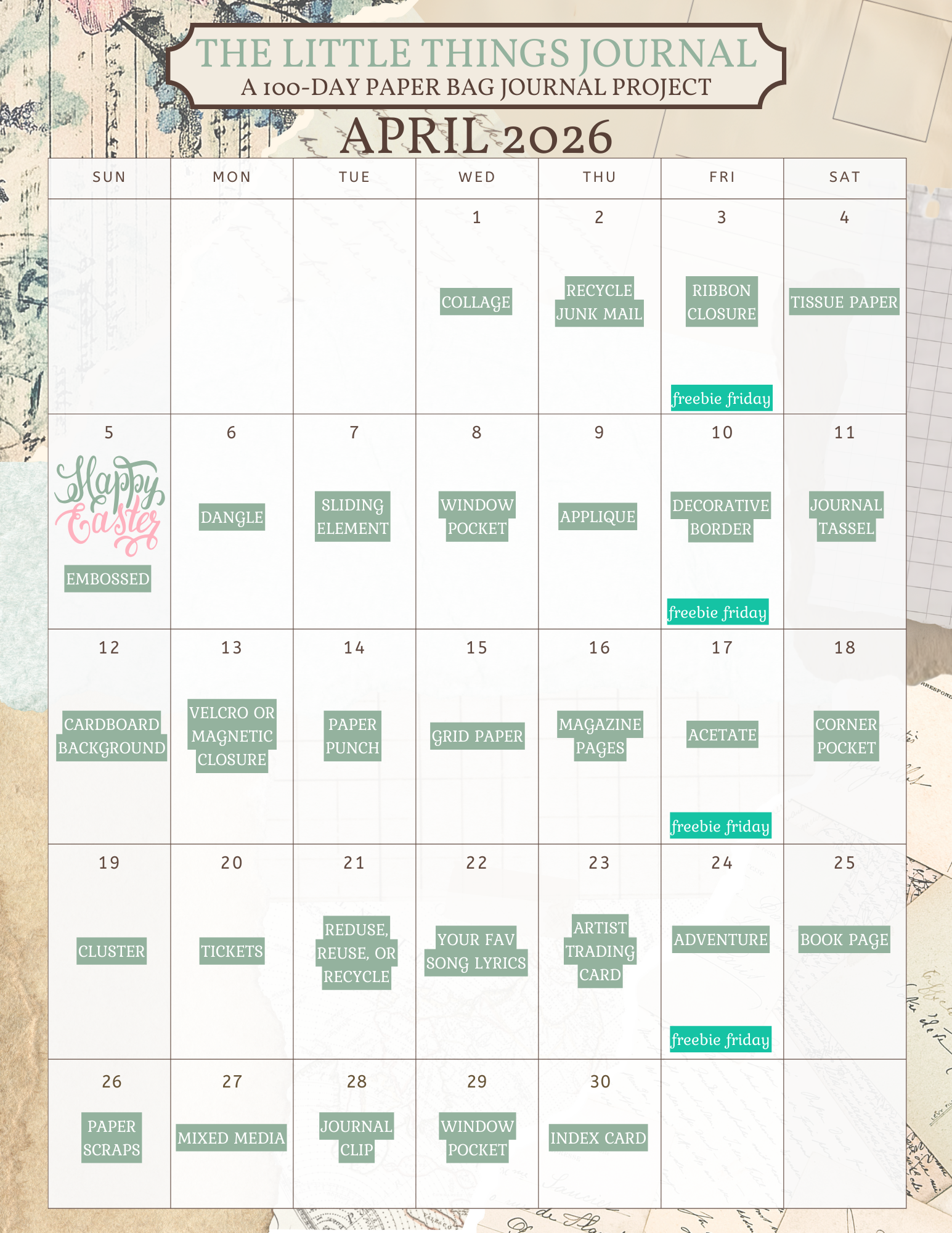 Every Friday, new printable goodies will be added to help you build and decorate your journal.